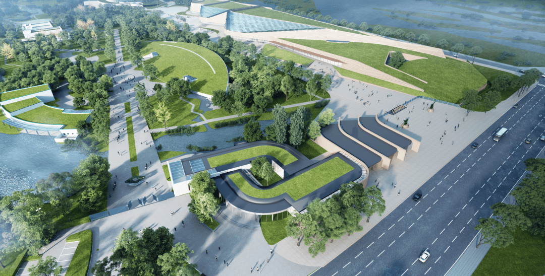 三星堆博物馆新馆设计将原青铜馆经典的螺旋曲线外墙进行延续发展,屋顶采用斜坡覆土形态,建筑消隐融入场地,与对面一号馆斜坡形体左右呼应,建筑形成三个沿中轴排列的覆土堆体,寓意“堆列三星”。