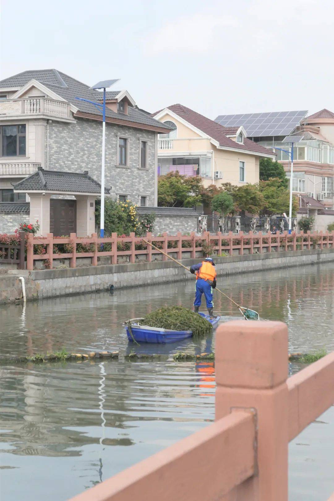 在陈泾江,清澈的河水缓缓淌过。阳光洒下,河面碧波粼粼,河岸绿植茵茵,河道养护专员正划着小船利用捞网打捞水草,河岸边还有一块方方正正的小菜园。漫步在此,一派水清岸绿、人水和谐的景象。