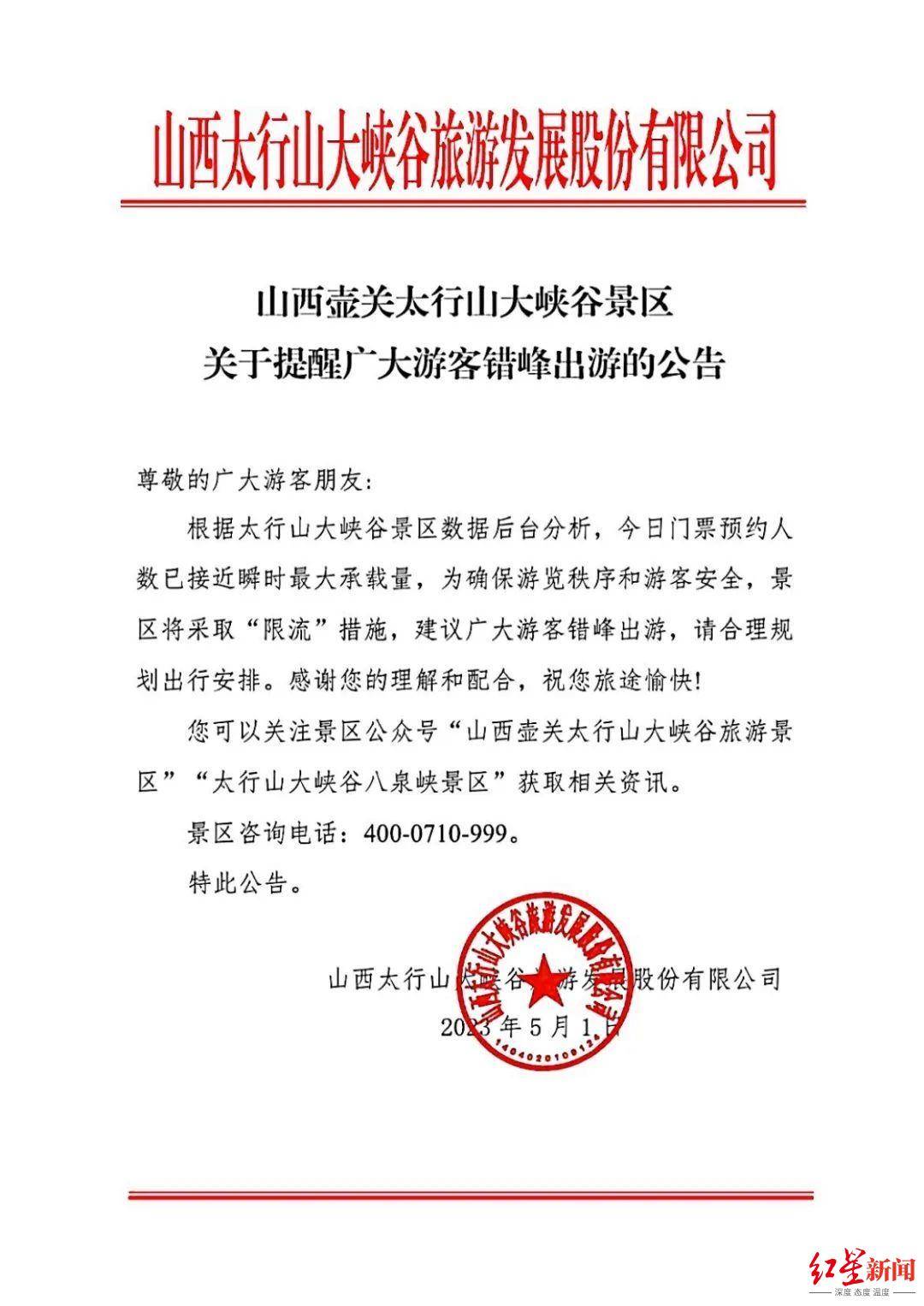 红星新闻记者注意到,5月1日当天,山西壶关太行山大峡谷景区发布了关于提醒广大游客错峰出游的公告。公告称,根据太行山大峡谷景区数据后台分析,当日门票预约人数已接近瞬时最大承载量,为确保游览秩序和游客安全,景区将采取“限流”措施,建议广大游客错峰出游,请合理规划出行安排。