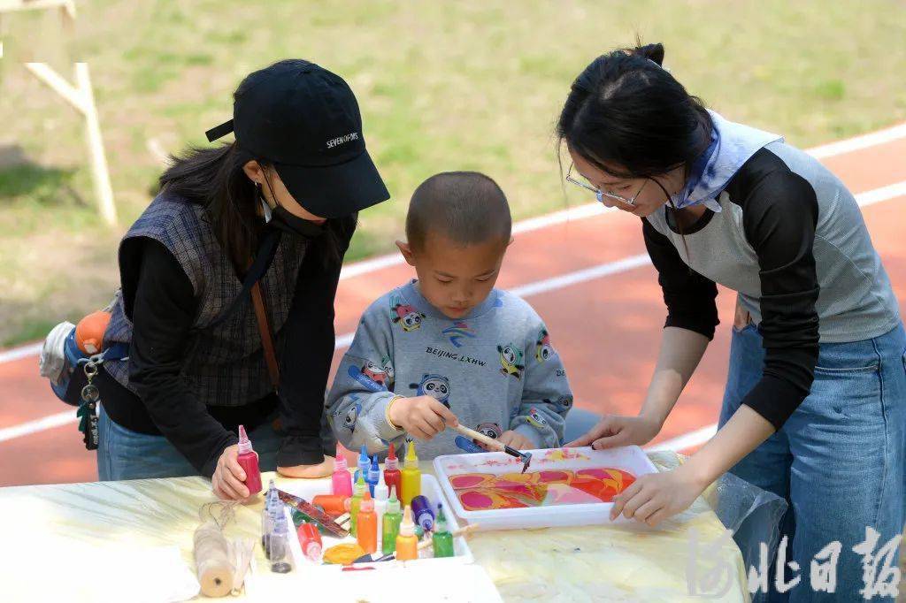 5月1日,小游客在永清县林栖谷景区制做水拓画。