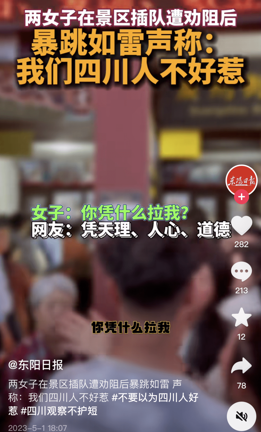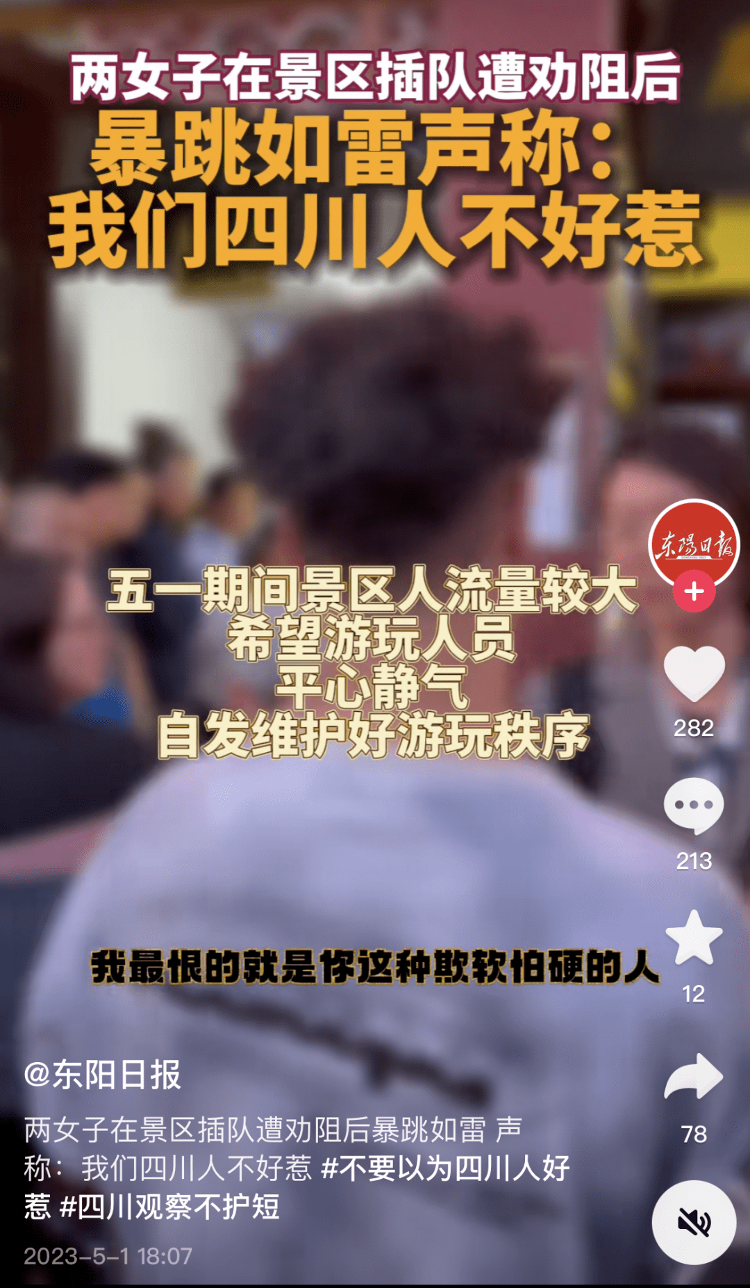 4月30日,我市横店影视城景区检票口处,两名来自四川的女游客插队遭人制止,不仅不听劝阻,还连番恶言输出,现场“恐吓”众人“我们四川人不是好惹的”,引发网友热议和抨击。