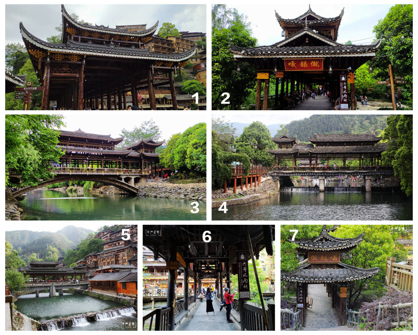 1,“哿嗡僦”,又叫“龙潭桥”;2,“嘎銩僦”;3,“僦哟妃”,又叫“游方桥”;4,“僦岽乧”,又叫“学子桥”;5,五号风雨桥;6,六号风雨桥;7,“僦餸嗡”,又为“回龙桥”。