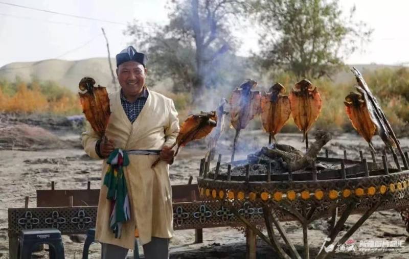 同日早上12点,尉犁县罗布人村寨景区内热闹非凡,这里不仅有歌舞快闪,还有餐饮店的响亮吆喝声。民俗家访点网红阿木东·艾木东的烤鱼景点前,也排满了等着拍照打卡的游客。