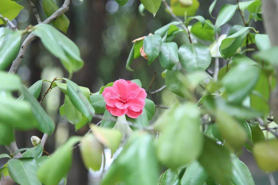 行至深处,伸手便可 触摸到手掌般大小盛开的花朵。原是彼处 山茶开得正盛。山茶花开,气势咄咄,郭沫若先生曾用“茶花一树早桃红,白朵彤云啸傲中”感叹山茶怒放的盛大场面。