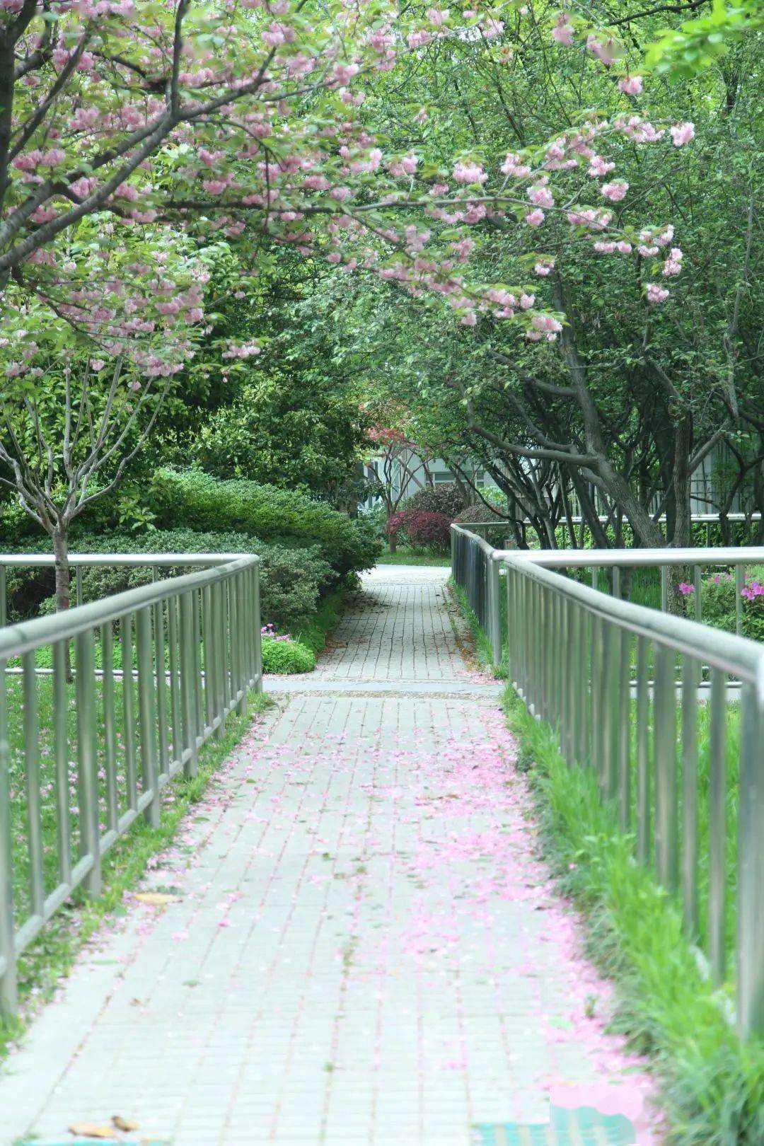 沿着围栏缓步前行,身旁的晚樱正随风飘落,伸出手感受花瓣落于掌心,空气中夹杂着那淡淡的花香,沁入心扉。