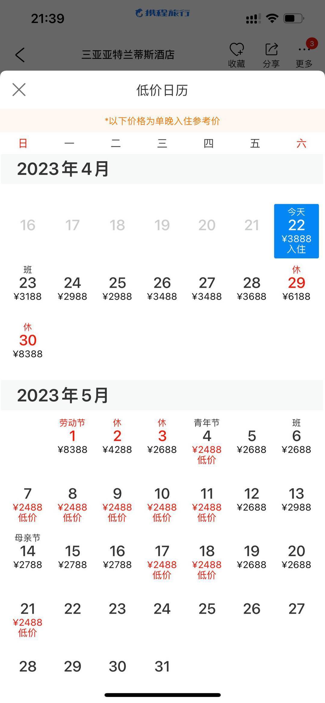 此外,记者注意到,今日起酒店的价格也开始回落。根据网友提供的三亚某酒店价格截图显示,该酒店日常价格在3000元左右的房间从4月29日涨至6188元,价格最高的是4月30日和5月1日,为8388元。5月2日,价格回落至4288元,5月3日起恢复日常价格。