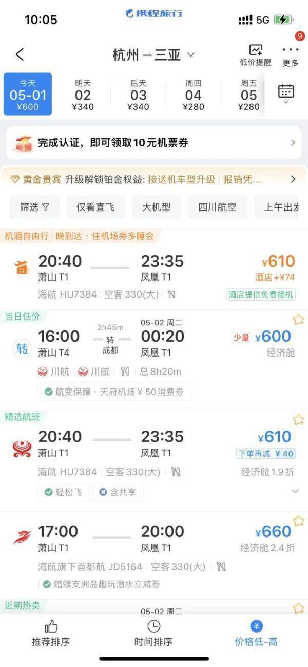 五一前,杭州飞三亚价格最低2800元,5月1日机票价格是610元,而到5月4日,杭州飞三亚居然只要280元。