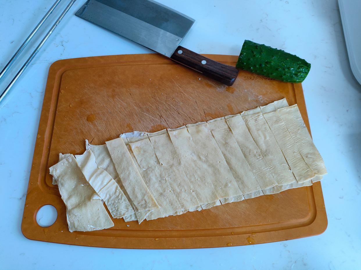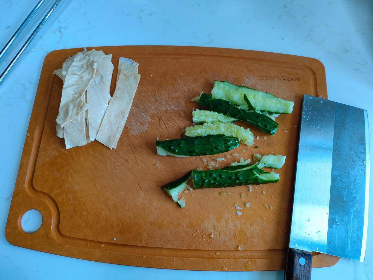 豆腐皮泡软后,切成条状。这里用了半张豆腐皮。