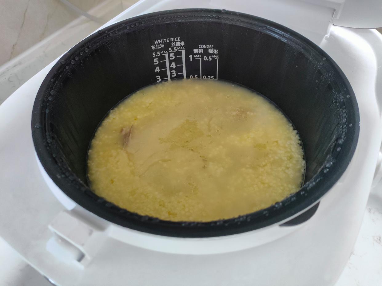 首先,晚上休息前,放入小米和排骨,加入姜片、酒、水,用电饭煲预约煮粥。第二天早上,打开锅盖就能吃,还有厚厚的米油哦,加点盐和葱花调味!