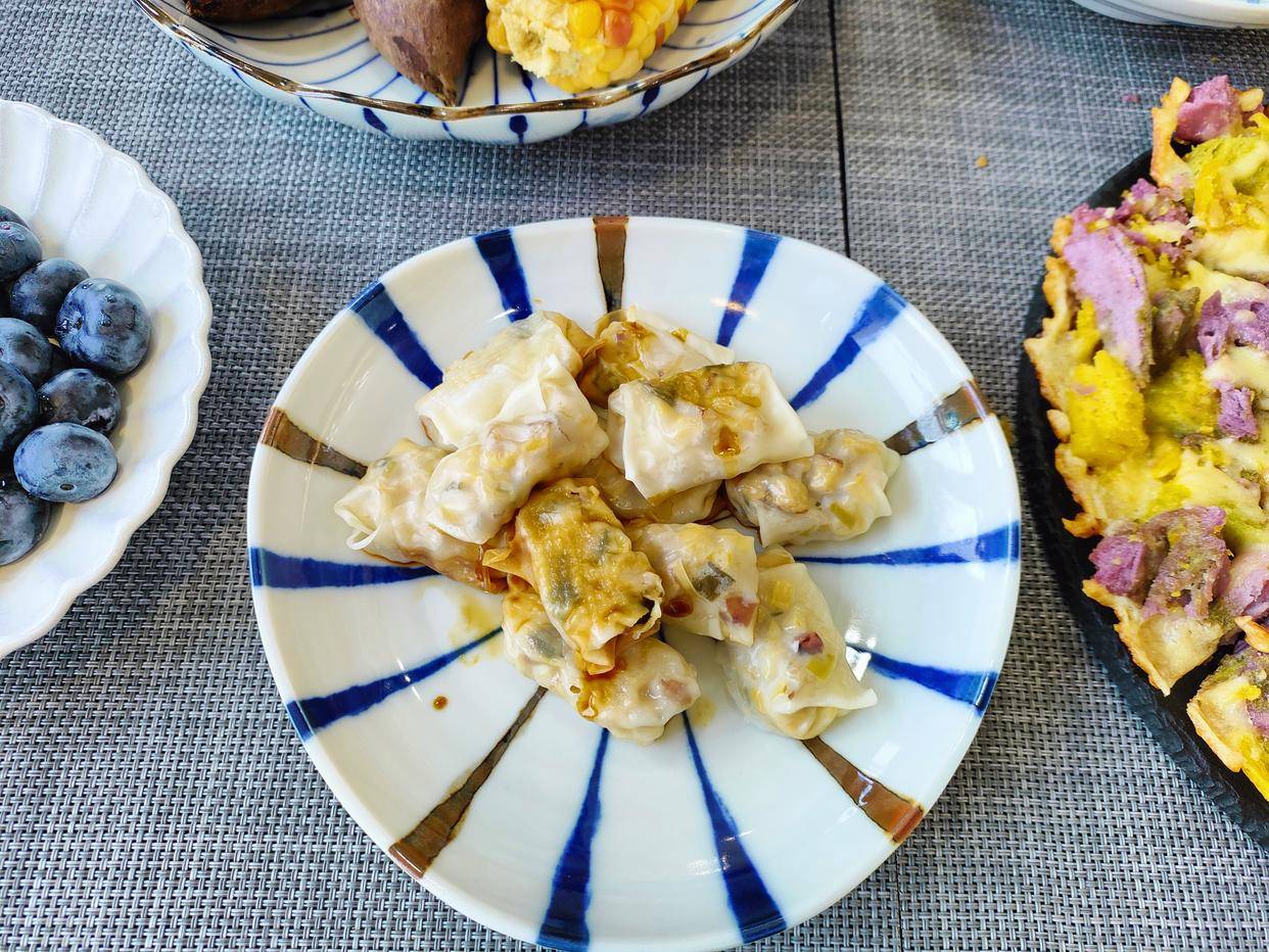 为什么呢?因为它是我用馄饨皮卷的,馅料是炒笋丁,随手卷的,冷冻在冰箱里,想吃的时候拿出来一蒸,脆脆的,很鲜美,简单又好吃!