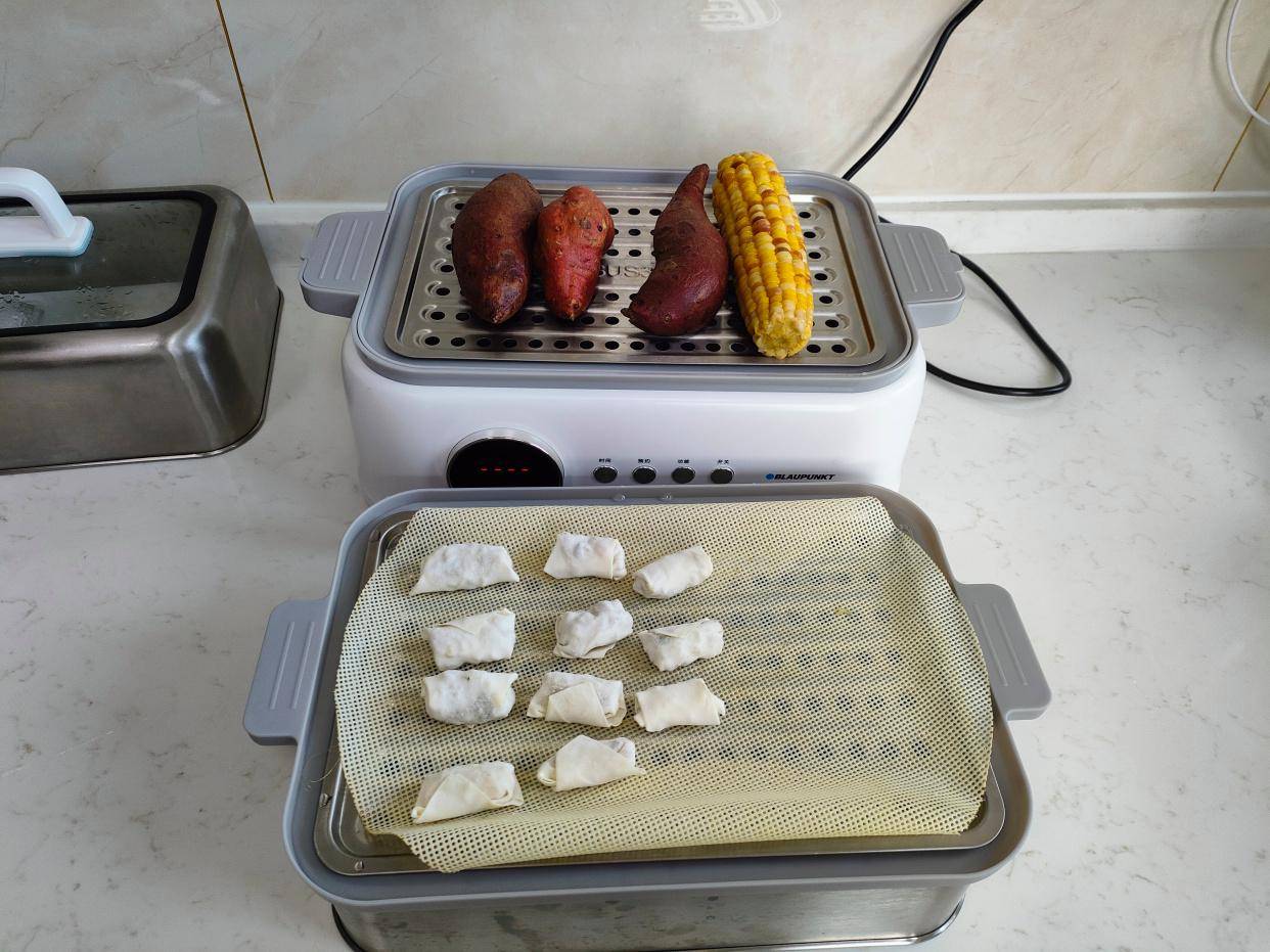 红薯、彩色玉米放在电蒸锅的下面一层,上面一层放馄饨卷儿。