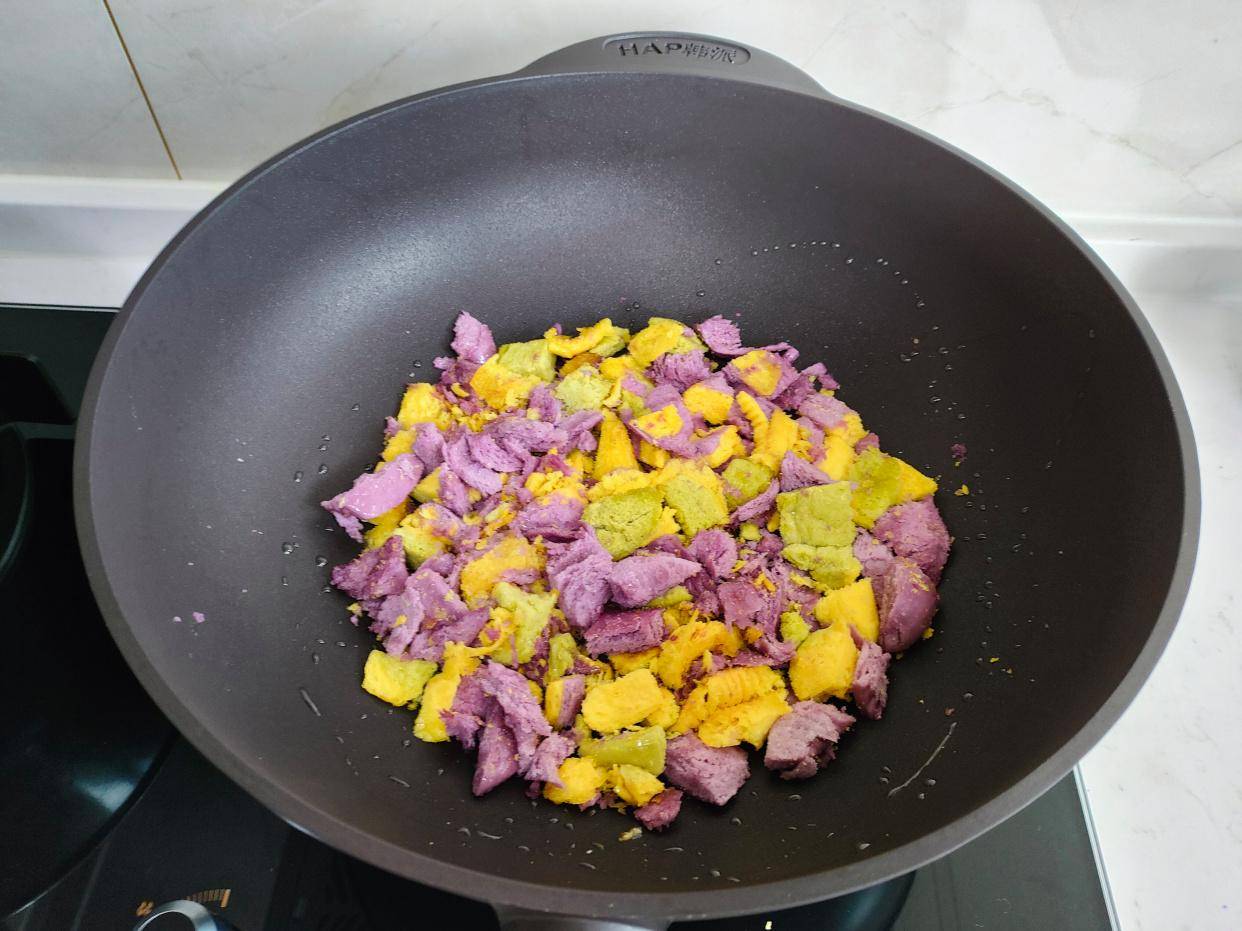 注意,这个一定要用不粘锅哦,否则容易粘底,除非油多一些。