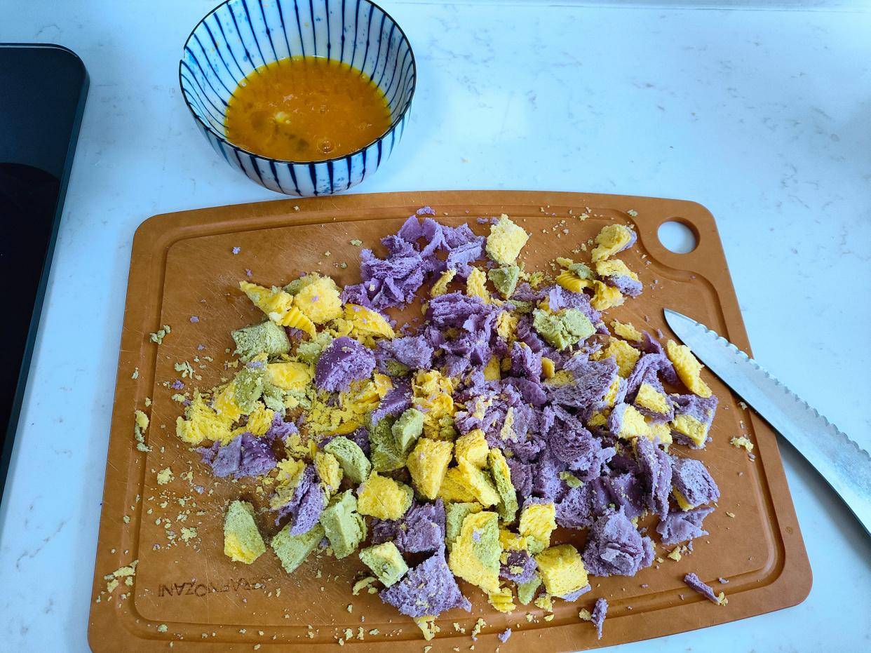 2个鸡蛋加少许盐打散,馒头切丁。
