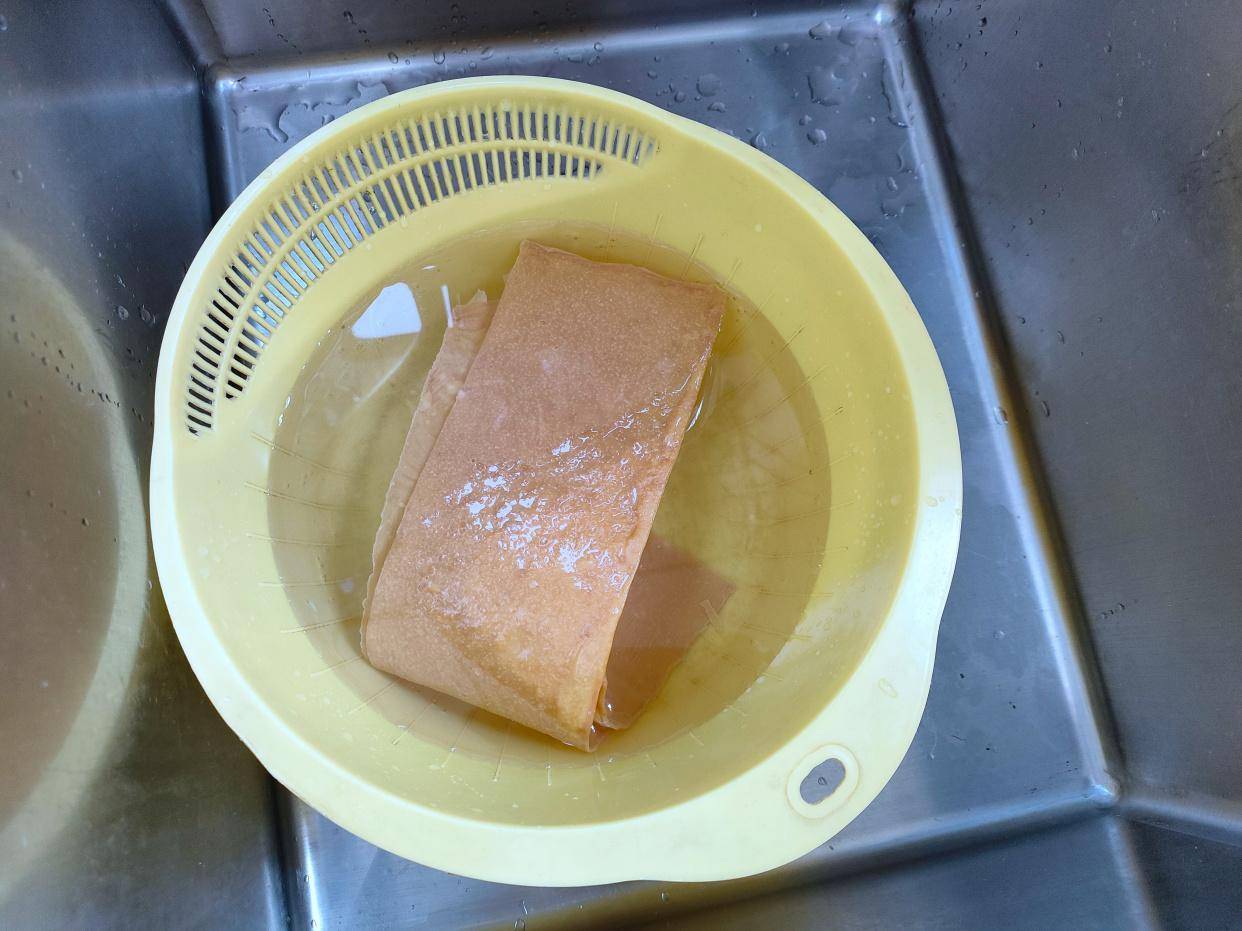 豆腐皮放入水中,先泡软。