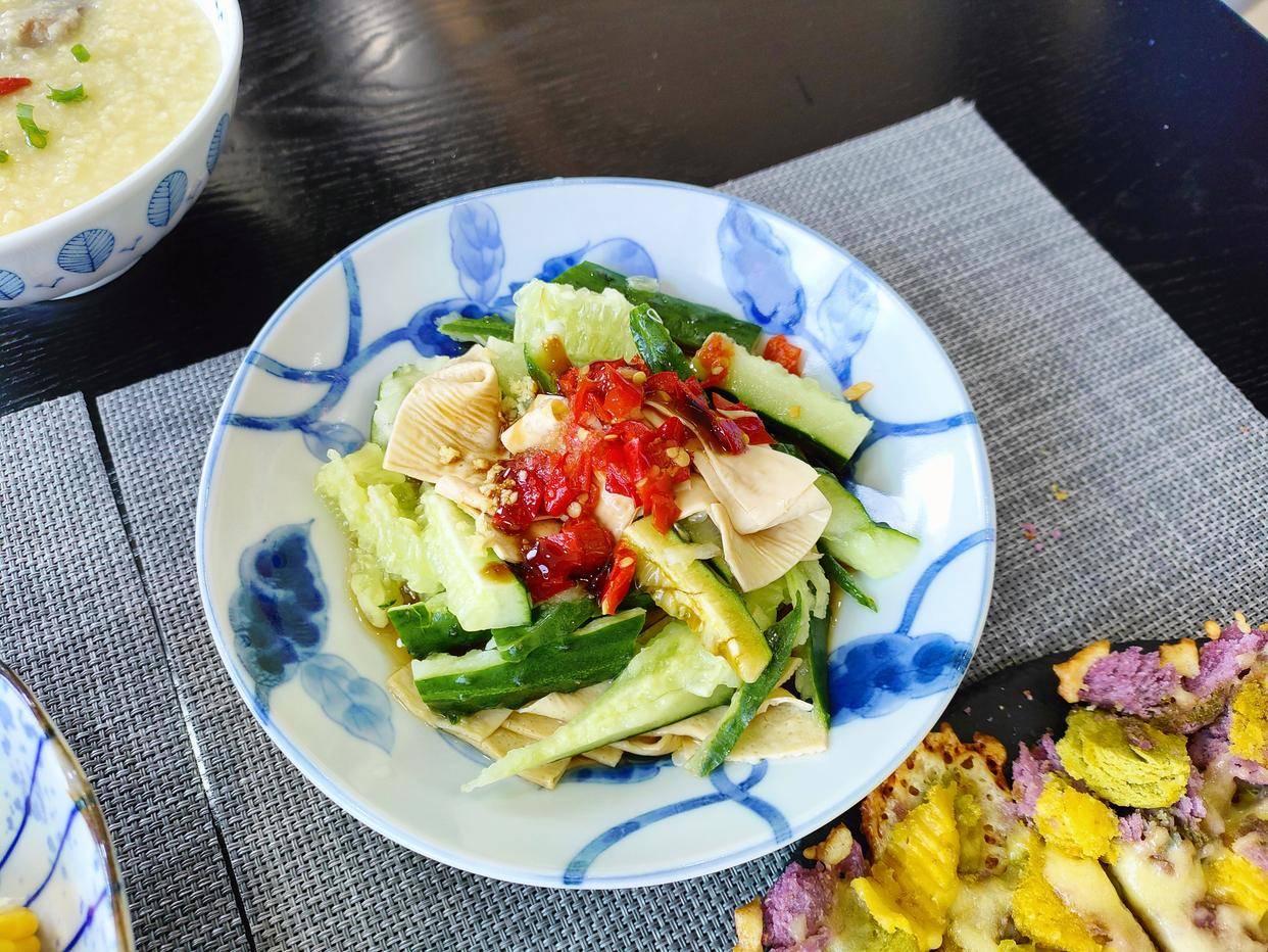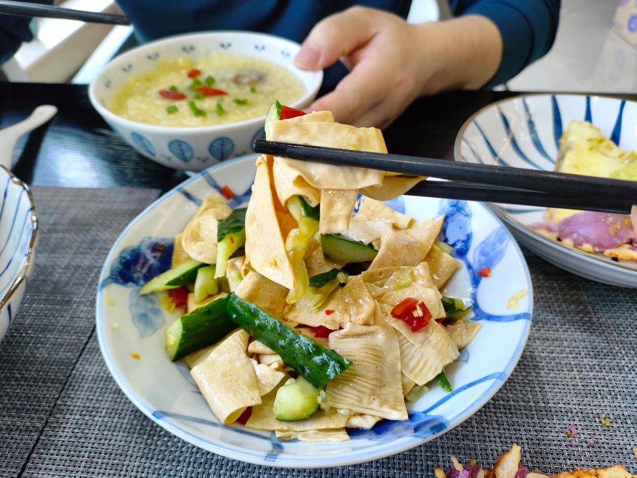 最后来个豆腐皮拌黄瓜,哎呀,豆腐皮滑滑的、美美的,搭配黄瓜,还真好吃呀!