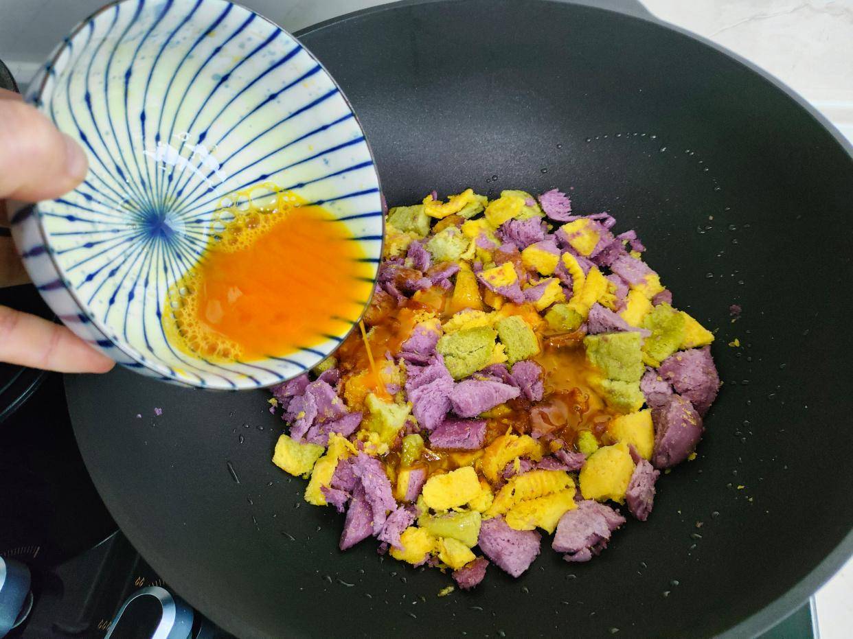 开小火,淋入蛋液,使馒头凝结。