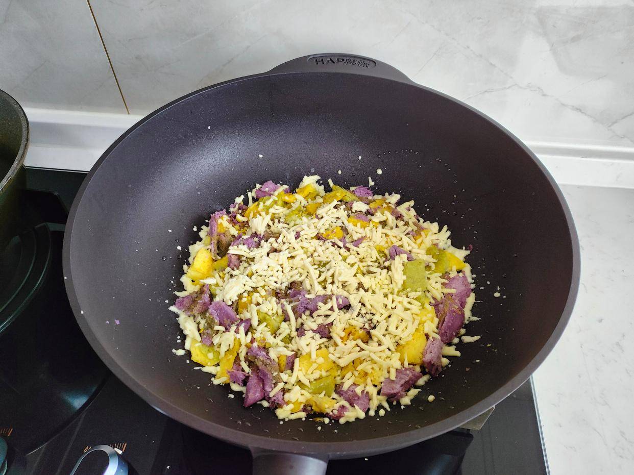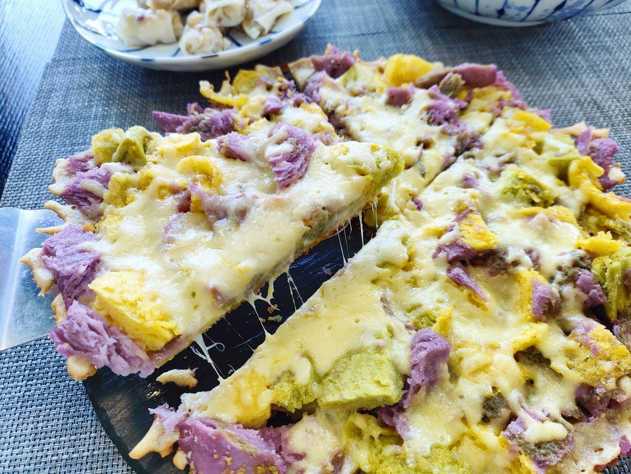 其实是一个馒头披萨饼,用了一个彩色的山东大馒头,切碎了,加点鸡蛋液,撒上马苏里拉芝士,会拉丝哦!