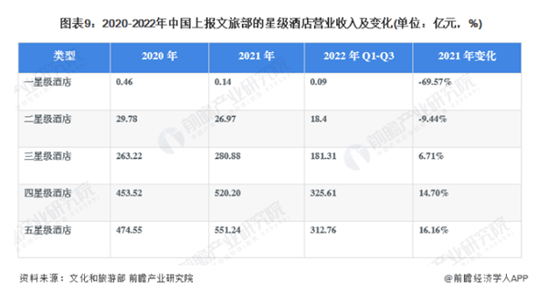回顾往年的酒店行业,2021年,从不同星级酒店的营收规模变化看,一星级和二星级酒店2021年营收较2020年分别下降69.57%和9.44%;三星级及以上酒店营收均增长,其中五星级酒店2021年营收达到551.24亿元,较2020年增长16.16%,在三星级及以上酒店中增长最快。
