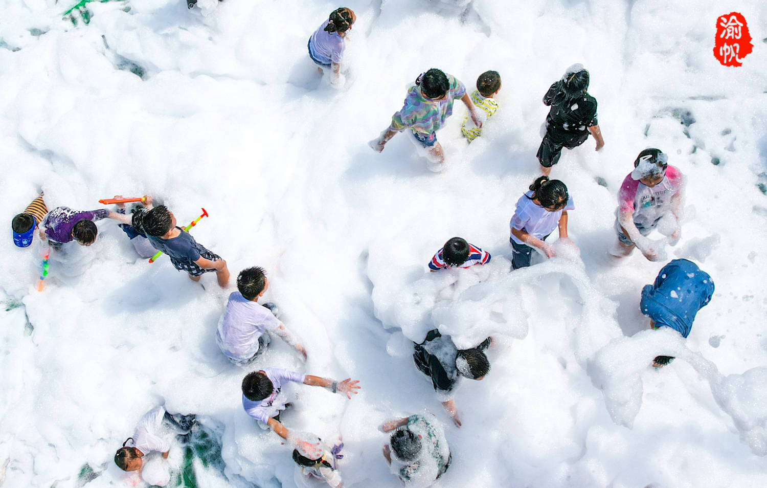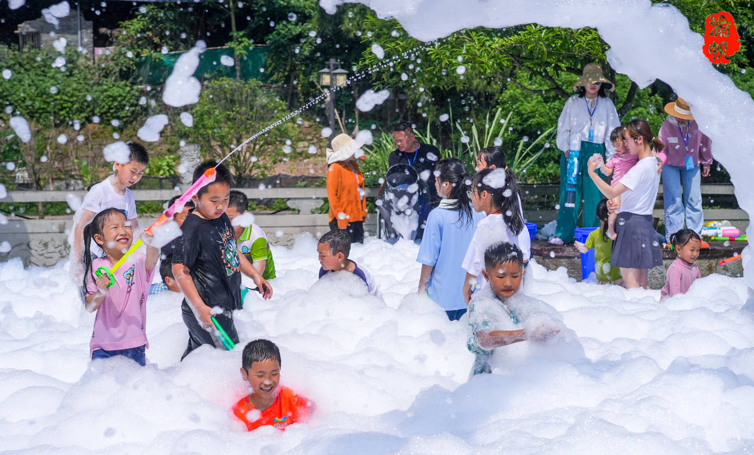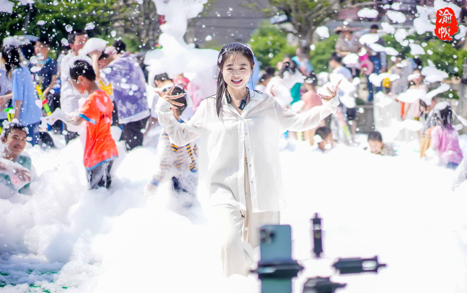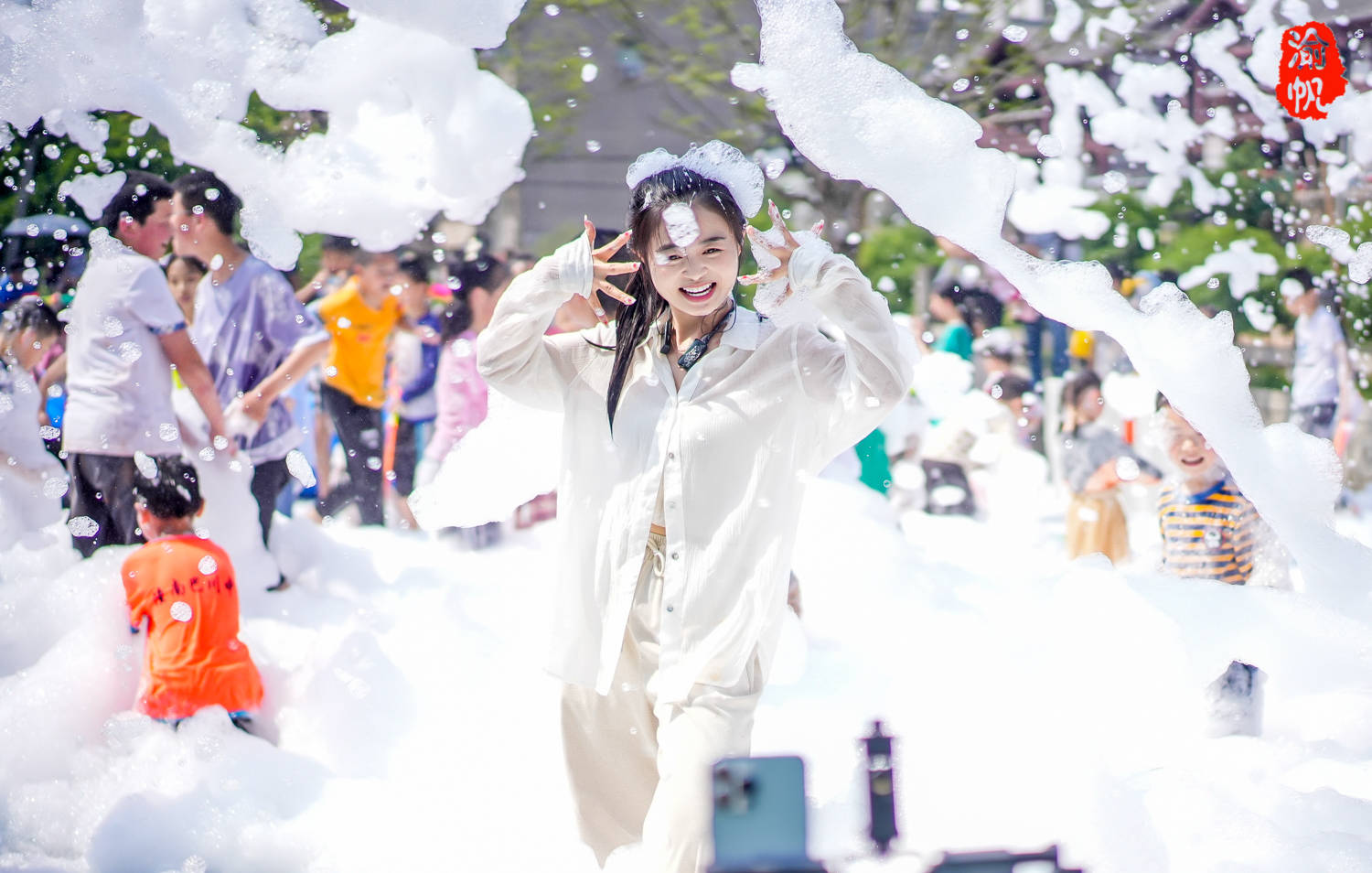 泡泡趴有一个固定的区域,由三台大型泡泡机围成一圈,漫天飞舞泡泡如同柔软的“棉花糖”一般,小朋友们在里面游走、嬉闹、乐在其中。连很多大人也忍不住脱掉鞋子进入其中,与子同乐,自由自在的享受节日的欢乐,仿佛回到童年,感受纯真的快乐,堪比傣族的泼水节一般。