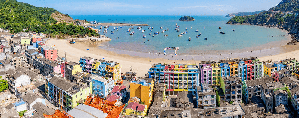 继续前行,体验浙南海岸的蓝色浪漫——霞关镇,去充满海岛渔家风情的老街走一走,逛一逛街边充满文艺气息的店铺,去看看墙壁上风格独特的渔民画,去搜罗搜罗凝聚霞关特色和文化的文创产品。在滨海小镇的烟火和人文气息中度过难忘的下午。