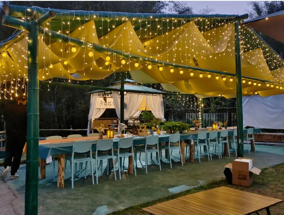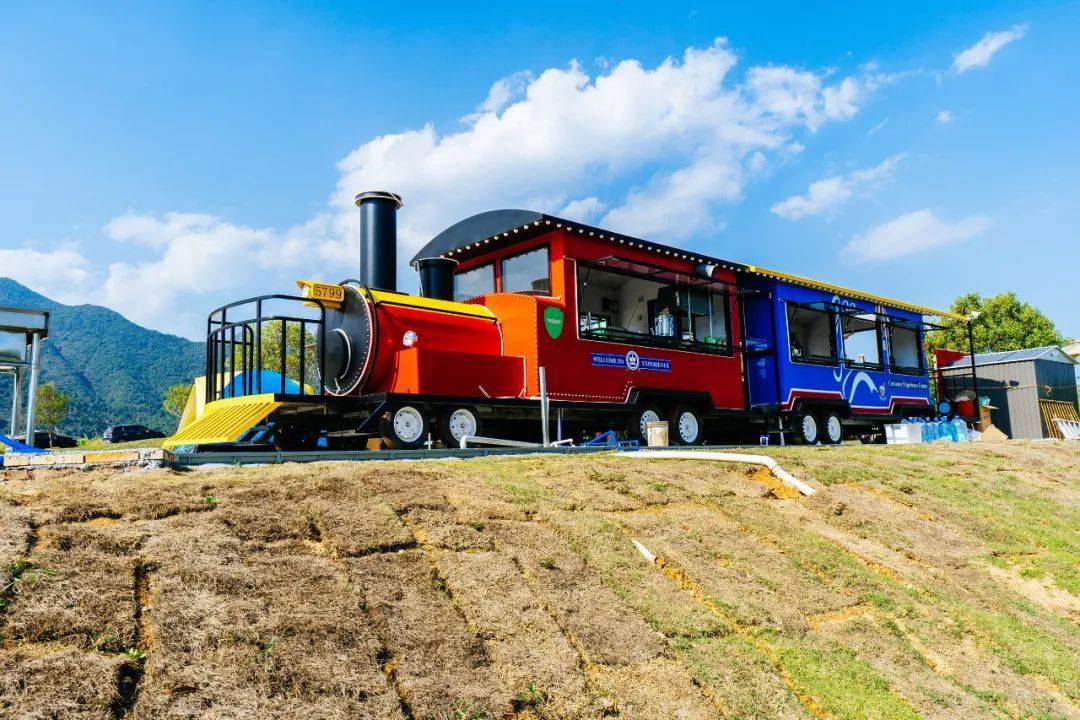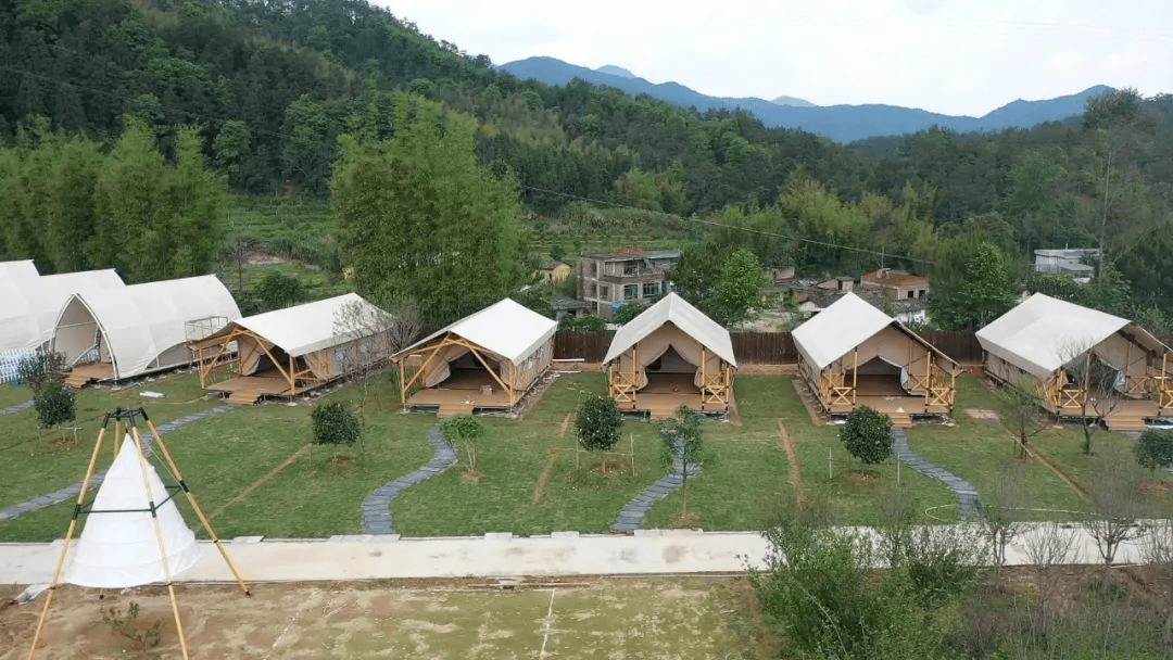 大风门旅游度假村内的大风优幕星空露营,有客家围屋、庄园式露营帐篷、田园天幕、小火车、 围炉煮茶等打卡游玩点,还能尝试新中式餐厅品味客家菜。