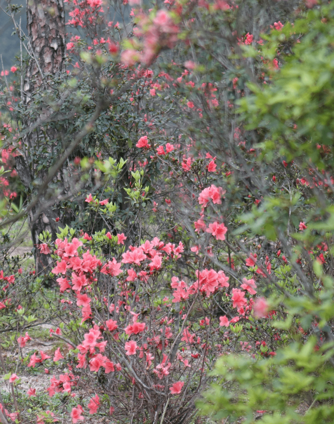 景区种植了多种花卉植物,此时,漫山遍野的映山红就爬满山头,朵朵涟漪,处处嫣然。