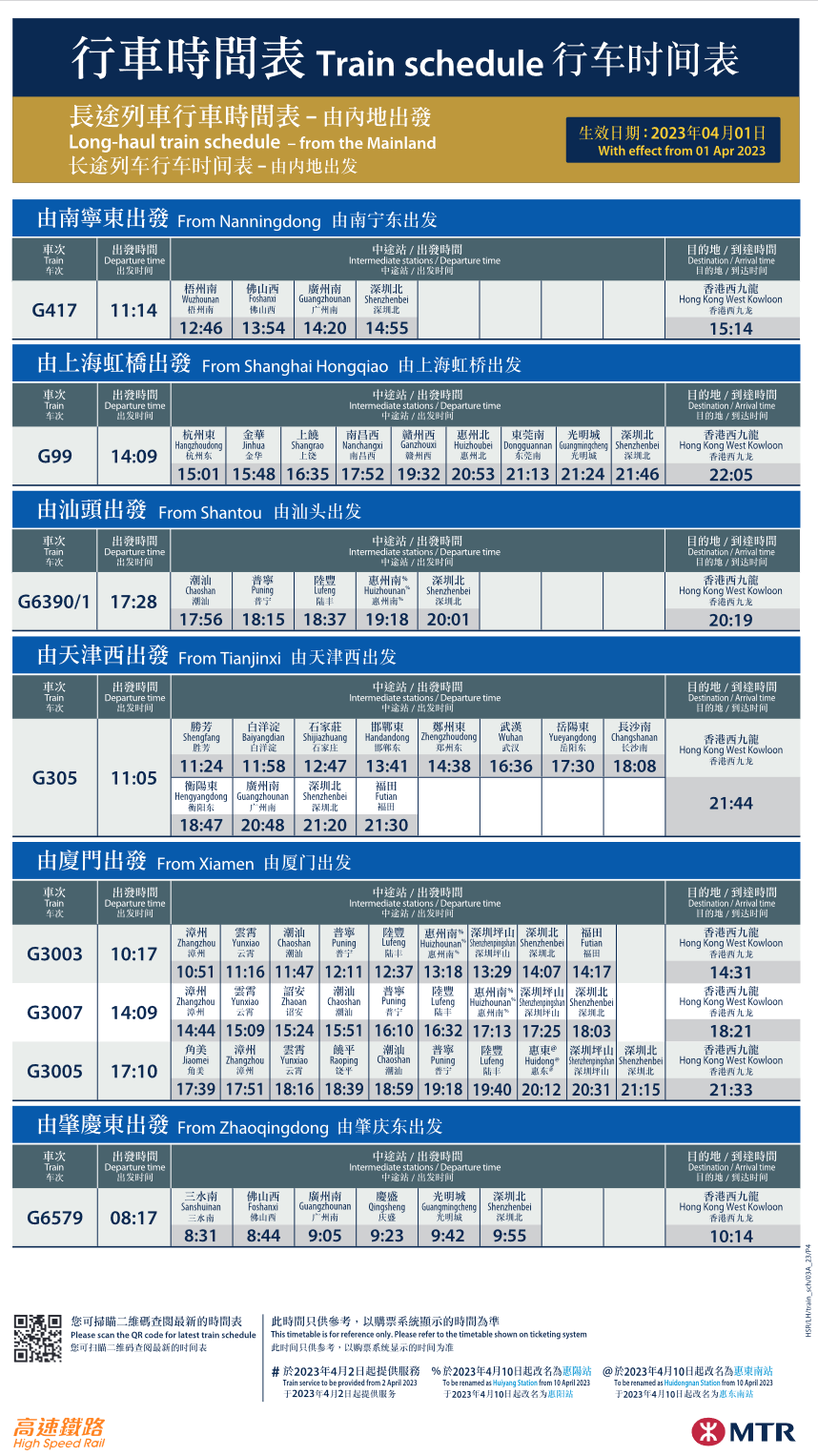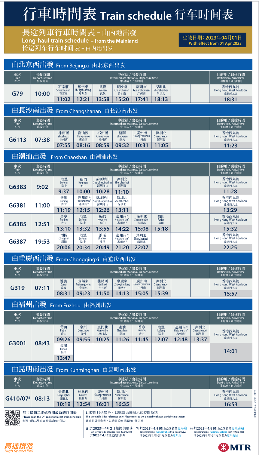 图:港铁公布长途列车时间表-由内地出发(4月1日起生效)