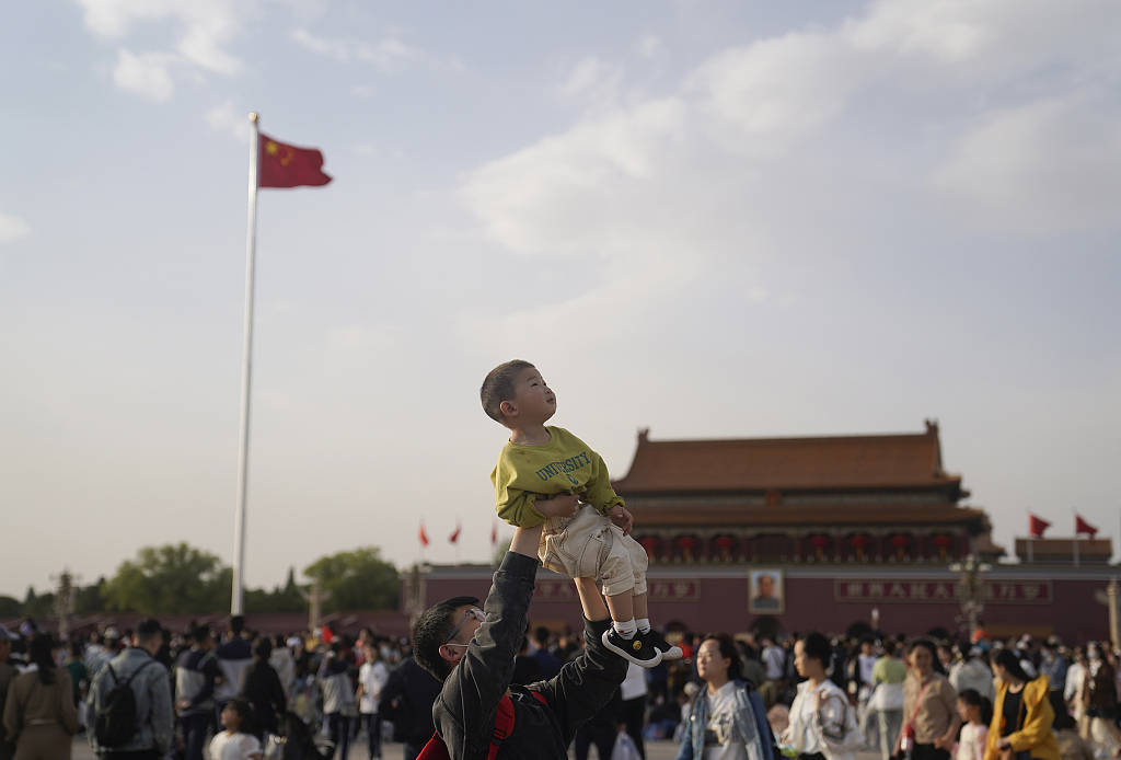 2023年4月29日,北京,在天安门广场上,一位父亲把孩子举起。视觉中国 图