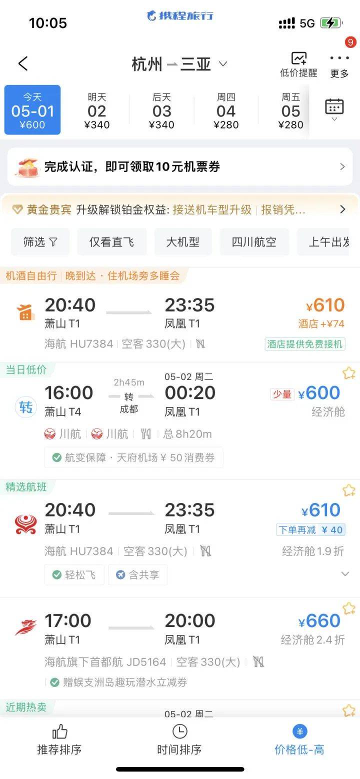 五一前,杭州飞三亚价格最低2800元,5月1日机票价格是610元,而到5月4日,杭州飞三亚居然只要280元。