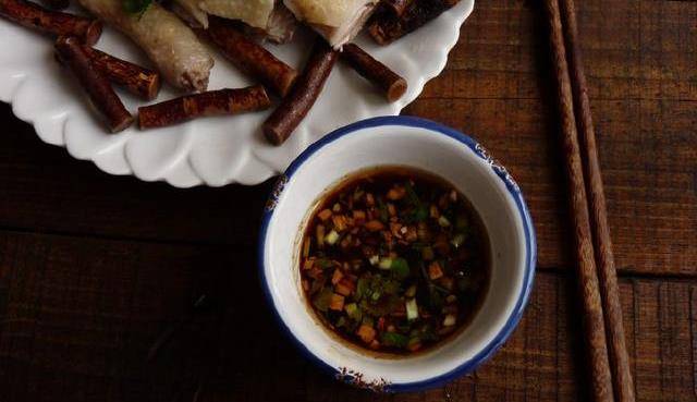 吃时切件上碟,把酱油、麻油、2匙的五指毛桃鸡汤、葱花、香菜末、姜末放一起,用以沾点鸡肉食用