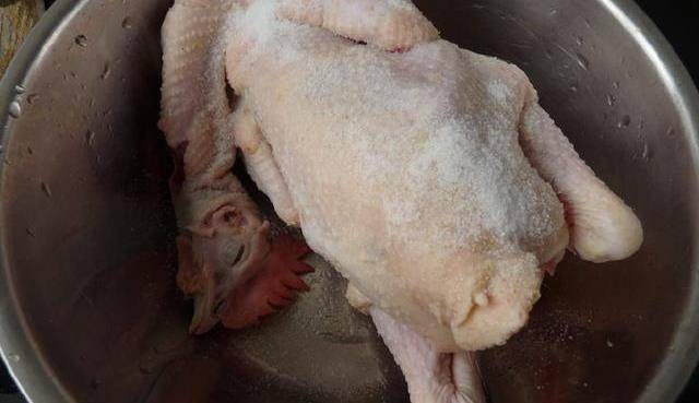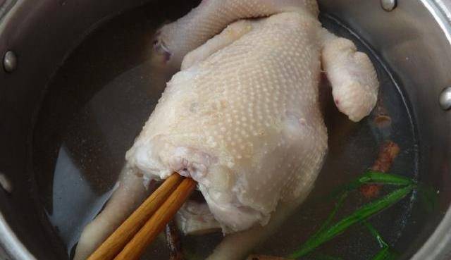 火力调到小火,把鸡浸到水里1分钟左右,捞起,晾在空气里3分钟左右,这方法重复三次