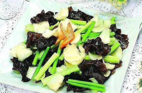 木耳芹菜炒百合:西芹是一种理想的绿色减肥食品。因为当你嘴巴里正在咀嚼芹菜的同时,你消耗的热能远大于芹菜给予你的能量。芹菜木耳炒百合是一道以木耳、芹菜、百合、蒜末等为主要食材制作的美食。这款素菜既美味又养生。