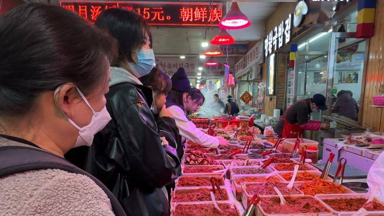此外,在特色市场里体验当地美食,也是打卡行程中必不可少的一环。其中,记者还遇到了一名来自山东淄博的姑娘,她选择反其道而行之,当全国游客在"五一"期间蜂拥去她家乡烧烤的时候,她一路北上,来延吉体验这里的特色烧烤。她告诉记者,这边的串、蘸料有一种本地的特色。来了以后吃了很多家店,到现在也没有"踩雷"过。