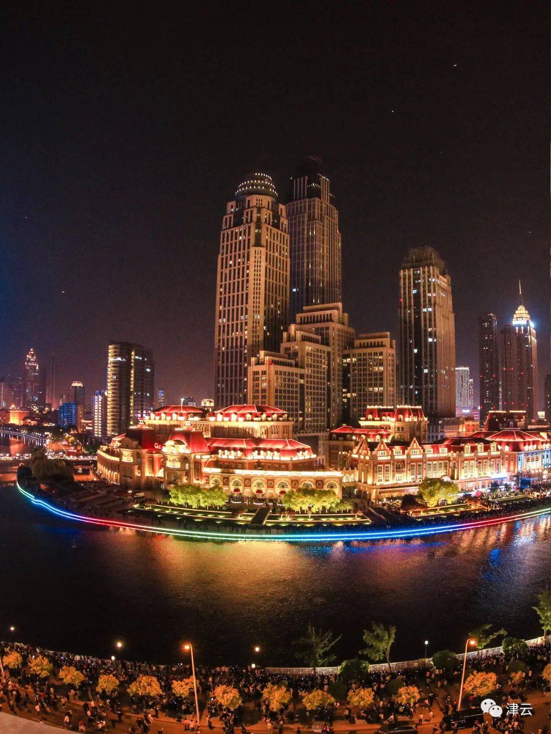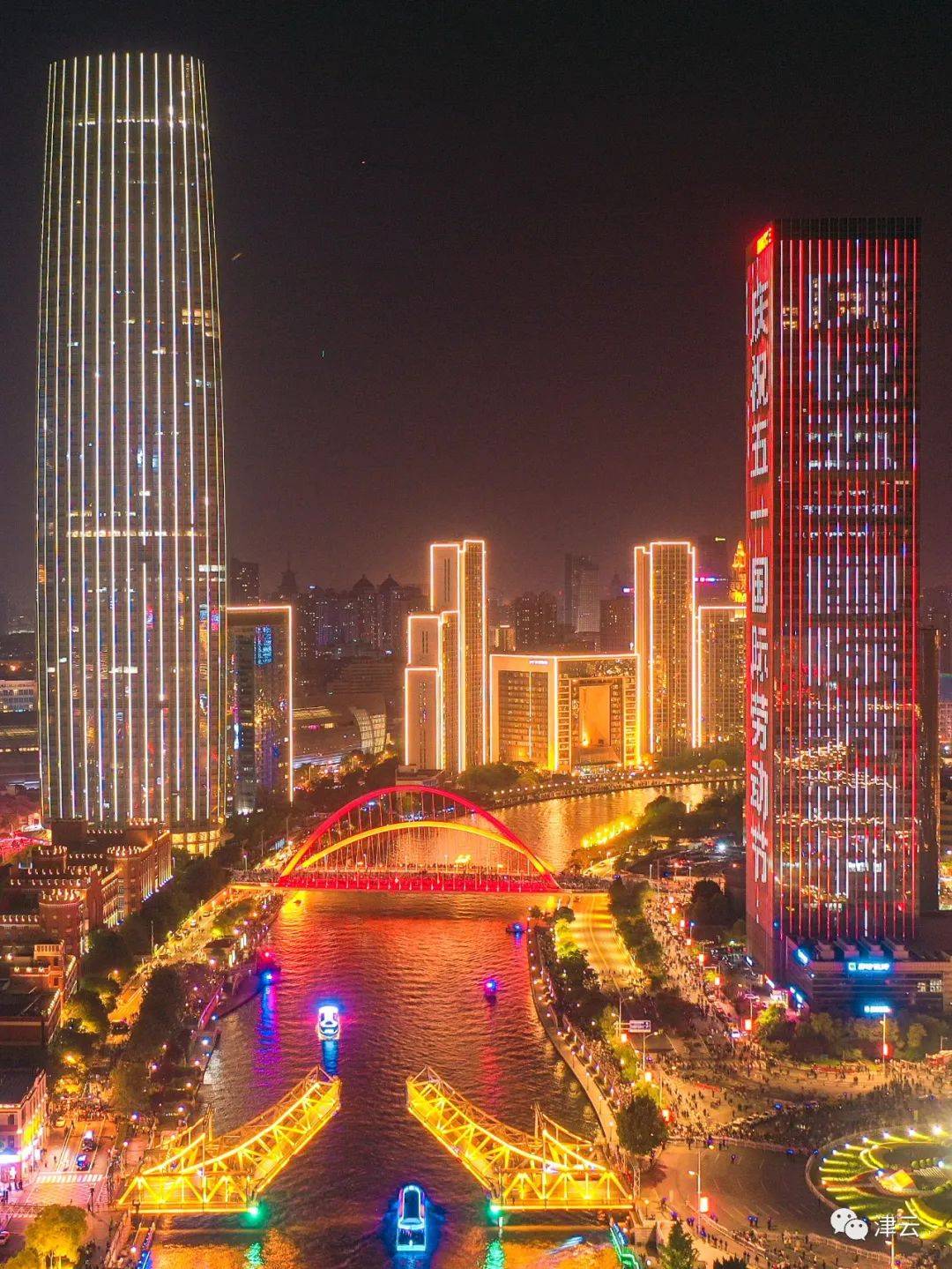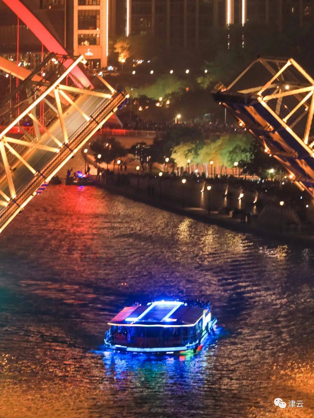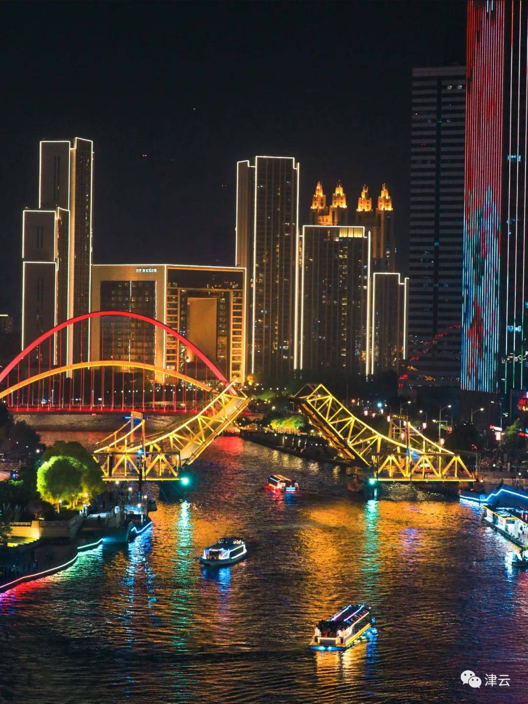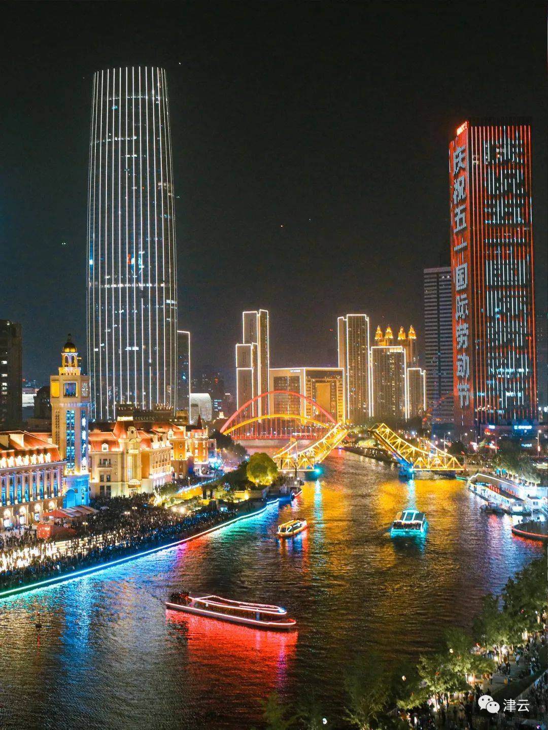 海河两岸,灯光旖旎,流光溢彩。海河游船,巡游出动,串珠成链。