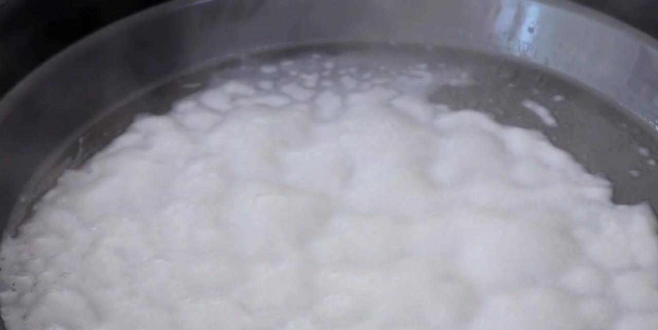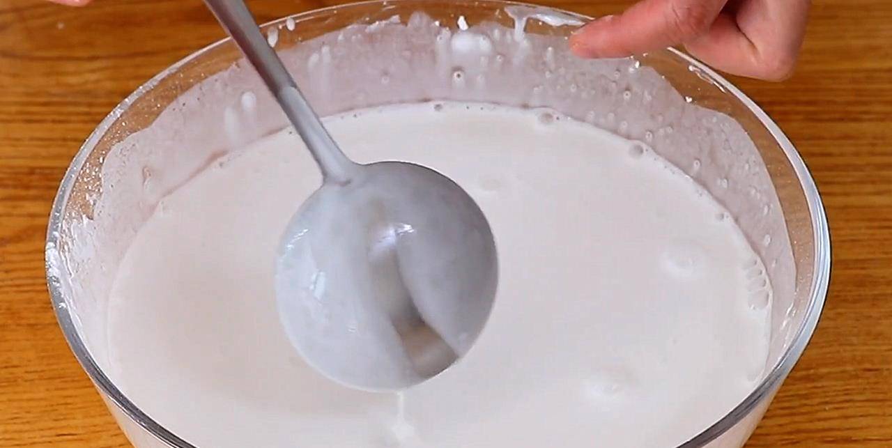 2不停地 搅拌,搅拌到没有干粉颗粒为止。粉浆比牛奶浓稠一点。勺子舀一勺是挂壁的状态。
