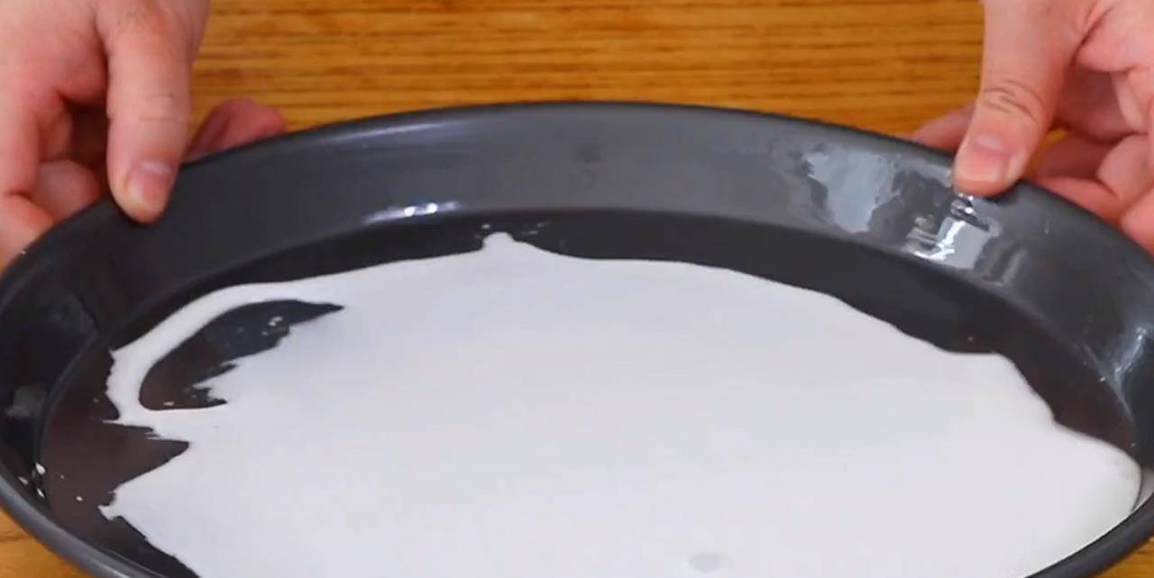 3.准备一个带一点的平盘。底部刷点油防粘。舀入米浆。晃动平整。