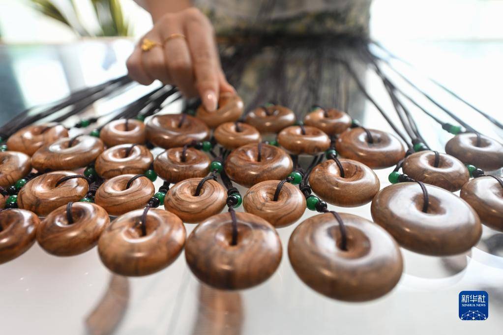 5月1日在海南花梨谷文化旅游区文创中心拍摄的黄花梨文创产品。