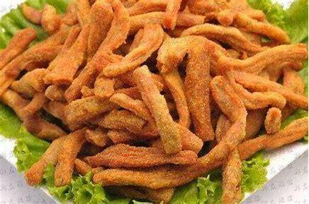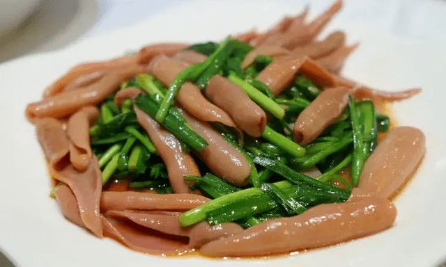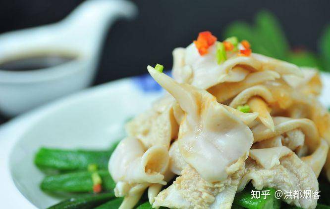 韭菜炒海肠:海肠原来只有在烟台及蓬莱沿海才有少量的出产,在胶东当地的渔民都把它称为“海鸡子”,虽然这海肠子长相很一般,不过它的营养价值还是很高的。