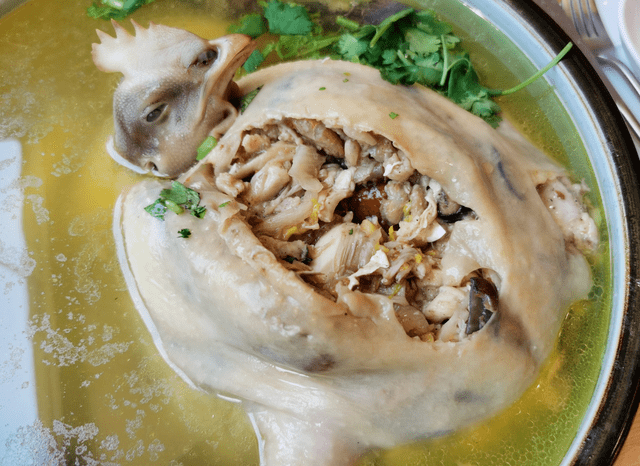 这是看着特别清爽的一道美食,盛在盘子里活像个趴着的整鸡,鸡脱骨后,肚里塞满海参、大虾、鸡丁、笋丁、香菇等,味道非常鲜美,这种塞满料的鸡肉,连同鸡汤都更鲜美,简直赞不绝口!