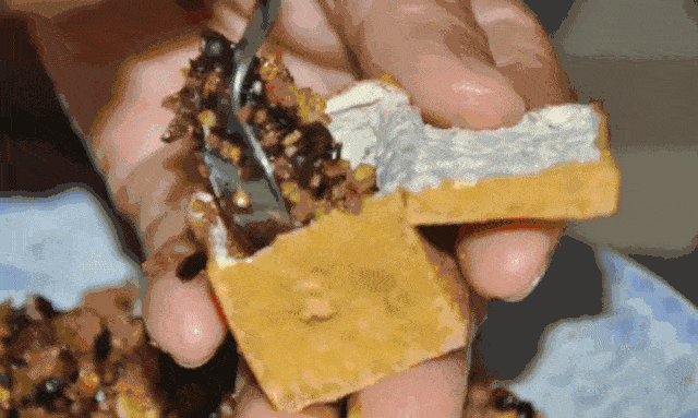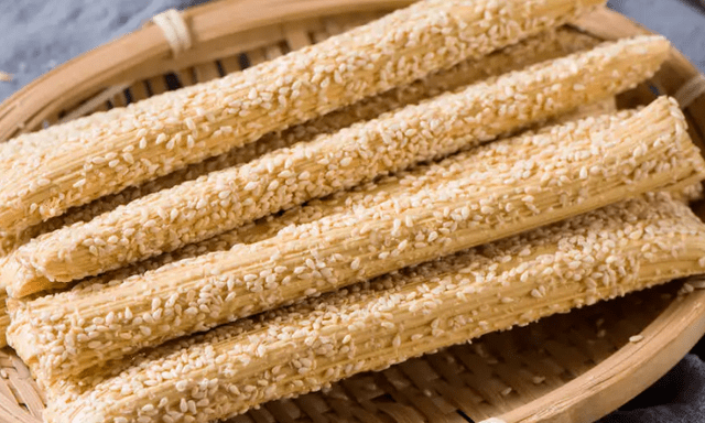 把熬至火候的糖浆晾至半凝胶状态,然后开始不断牵拉,牵拉的过程不断加入研磨成粉的芝麻碎。最后形成细如发丝的金黄色糖丝,中间夹杂着馥郁浓香的酥芝麻粉,吃起来香酥甜脆、馥香怡人。