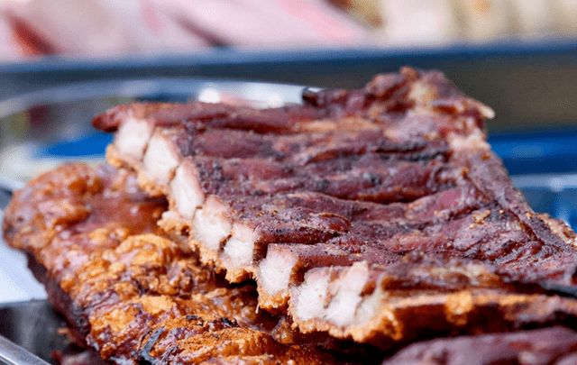 黄家烤肉是将猪全部拔毛去除内脏,加入调味料腌制后放入烤箱烘烤而成。刚烤好的烤肉香气扑鼻,只要闻到气味就有食欲,吃皮酥脆的肉,脂肪不腻,越嚼越香。