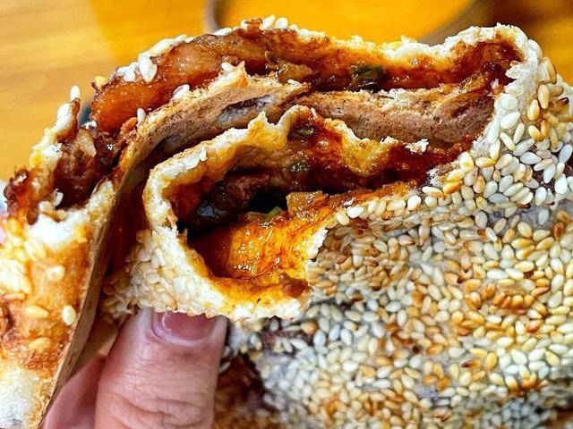 它表面看着平淡无奇,其实里边却大有乾坤,它是用内外8层皮卷上葱花肉,吃着松软可口,又香又嫩,面皮还有韧性。