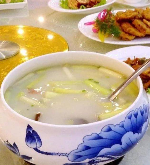 奶汤蒲菜:济南大明湖出产的一种质地鲜嫩、味道清鲜的蒲菜为主料,加奶汤烹制而成,素有济南汤菜之冠的美誉,又历来被人们誉为济南第一汤菜。