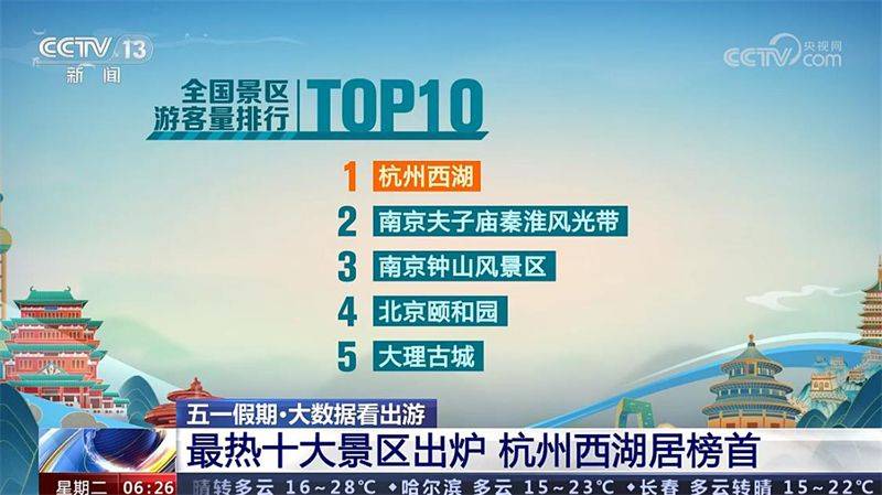 央视新闻5月2日消息,4月29日零时至5月1日16时全国“五一”最热十大景区出炉,大理古城上榜,排名第五!