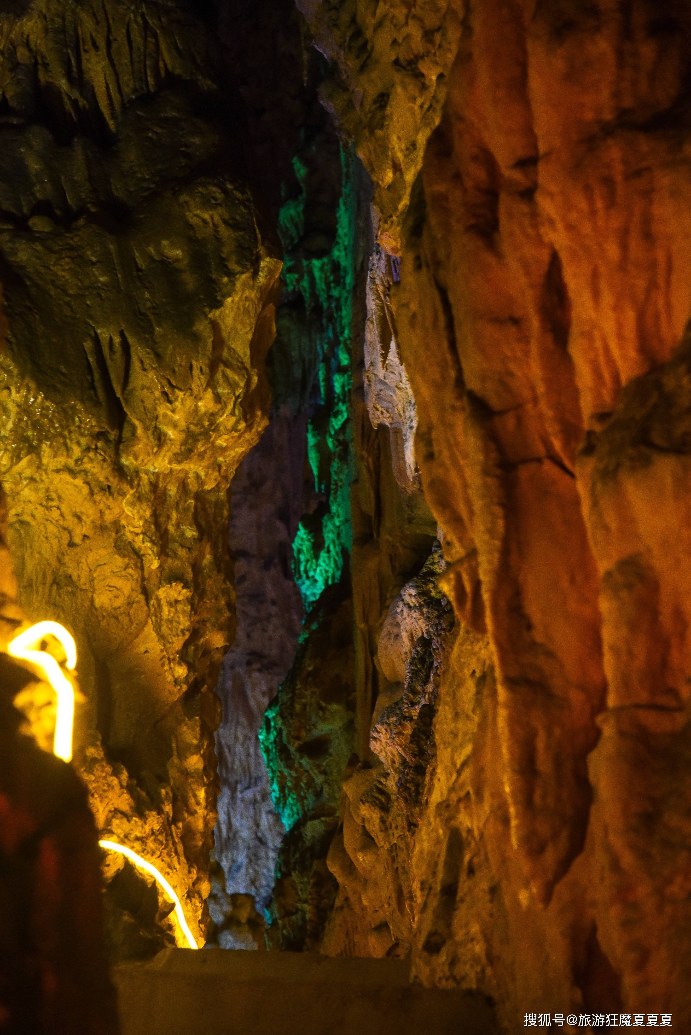 从洞口进入后,整个参观路线长约三公里,分成了上下两层共计四个大厅,可以先乘坐观光电梯到达顶层之后,在沿着台阶一路向下参观,比起一般溶洞景区又上又下的参观路线来说轻松不少,不仅如此,早在约600万年前的晚中生代就开始形成的钟乳石琳琅满目,各种钟乳石、石笋、石柱等地质景观齐全,堪称溶洞版的地质大观园。