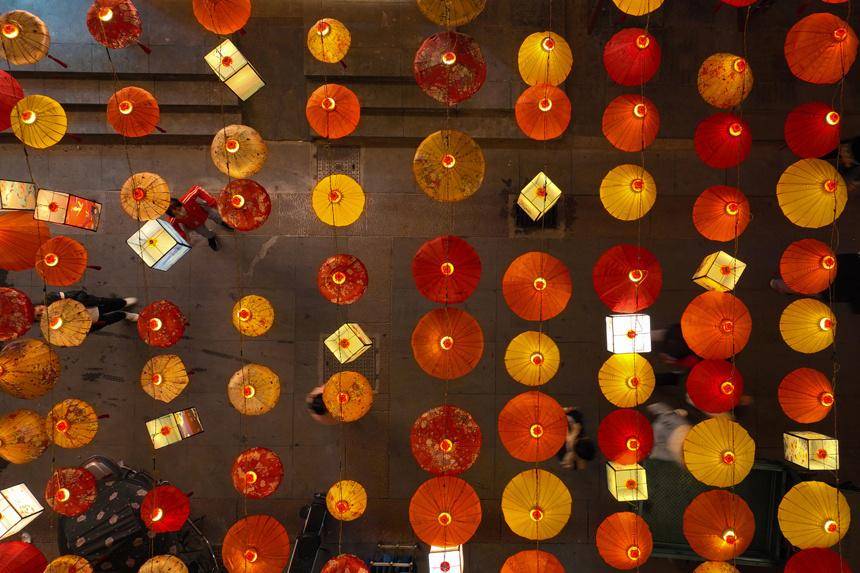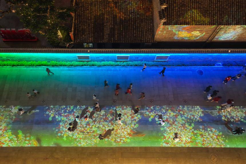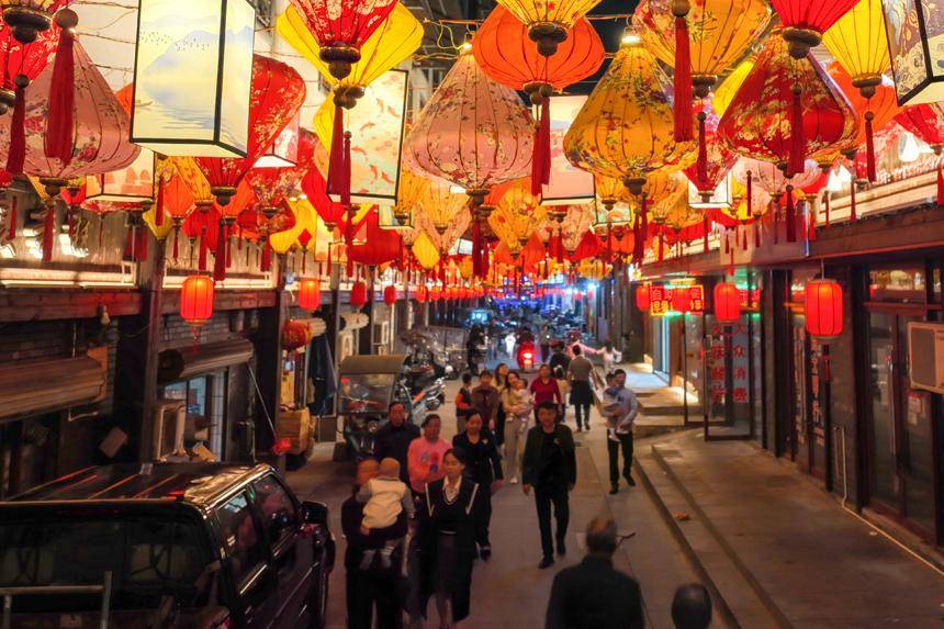 5月1日,华灯初上,江西省吉安市遂川县红色文化街区灯火璀璨,流光溢彩,吸引了众多市民游客游玩。