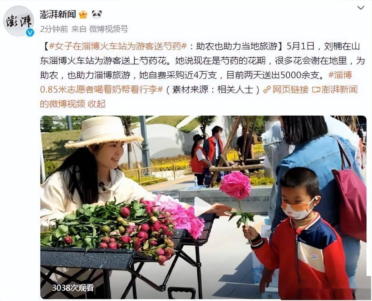 在淄博,出了淄博站,站外有送矿泉水的,有志愿者为外地人引路的,还有送芍药花的。据澎湃新闻报道,5月1日,一女子在淄博火车站为游客赠送芍药花。她说,现在是芍药的花期,为助农,也助力淄博旅游,她自费采购了芍药花赠送给游客。