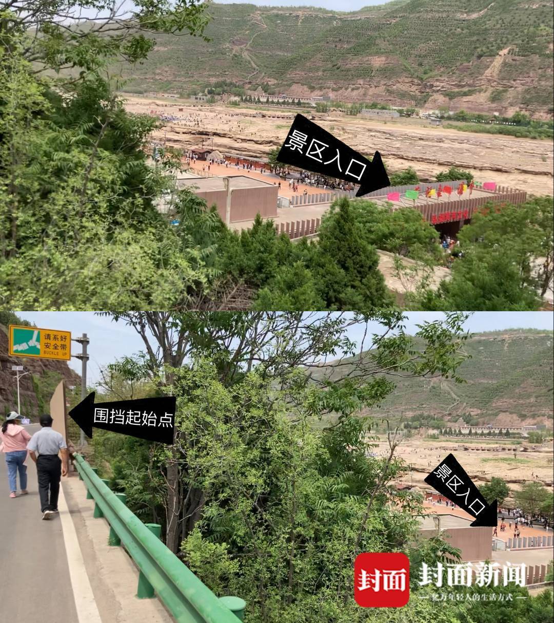 游客小陈(化名)告诉封面新闻记者,她和父母自驾游来壶口,因游客中心拥堵、停车困难,一行人排队等了许久。她们了解到,自驾游客需要在游客中心停车后(需收取停车费),统一乘大巴车到景区观景,游客中心到观景台距离约8千米,大巴车票价40元一人,景区门票100元。“下去(进入景区)的路是内部路,入口有保安,只有旅游大巴能下去。”小陈的母亲想在路边找找能看到瀑布的位置,但都被围挡遮住了。