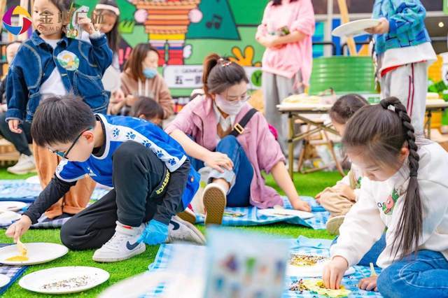 活动现场人头攒动,活动老师给宝贝们分发好创意手工的材料,绿豆、红豆、白色的大米、黑色的芝麻、黄色的小米……在爸爸妈妈的协助和老师的带领下,宝贝们发挥自己的创意想象,将不同颜色的粮食拼出各种奇思妙想的画作。