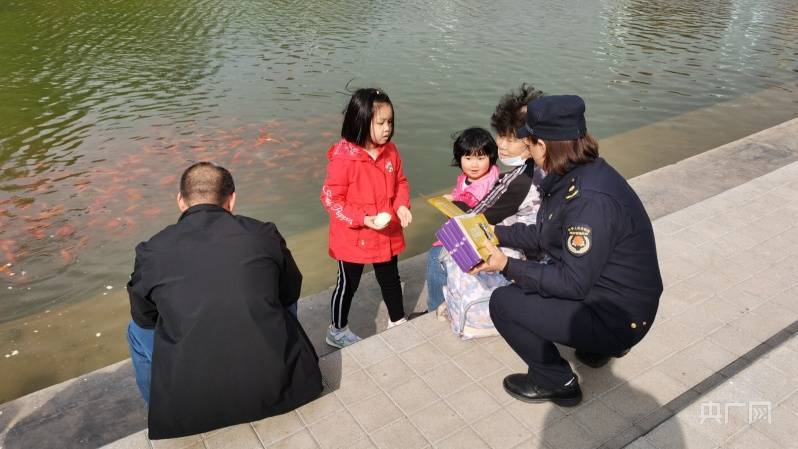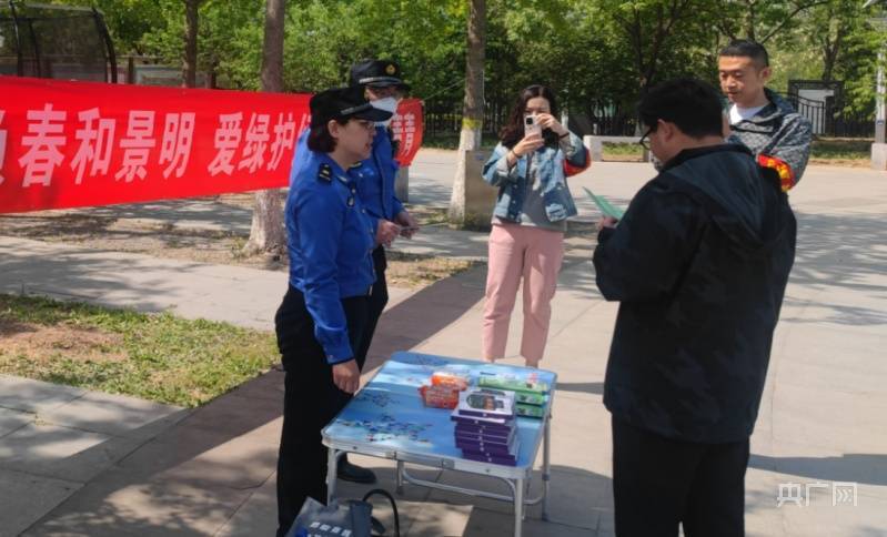 执法人员向游客发放文明游园宣传手册(央广网发 石景山区古城街道供图)